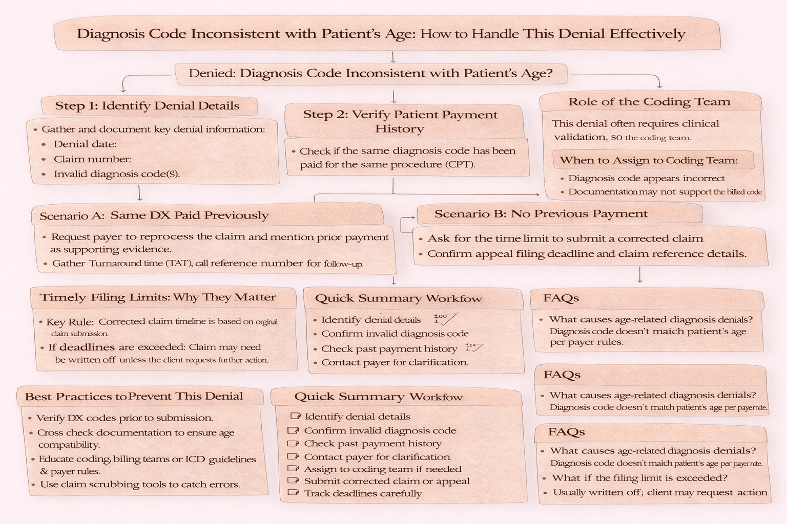 Handling a denial for “diagnosis inconsistent with patient’s age” requires a methodical approach involving verification, communication, and collaboration with the coding team. By understanding payer requirements and maintaining accurate documentation, you can significantly reduce such denials. A proactive strategy combined with proper training and validation tools can help ensure cleaner claims, faster reimbursements, and a more efficient revenue cycle.