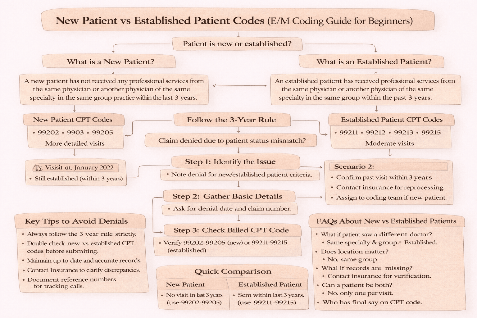 In medical billing, one of the most common reasons for claim denials is confusion between new patient and established patient codes. These are part of Evaluation and Management (E/M) coding, and selecting the wrong code can directly impact reimbursement. If you’re new to healthcare billing or working in revenue cycle management, understanding this distinction is essential. This guide breaks down the concept in simple terms, explains common denial scenarios, and provides actionable tips to avoid mistakes.